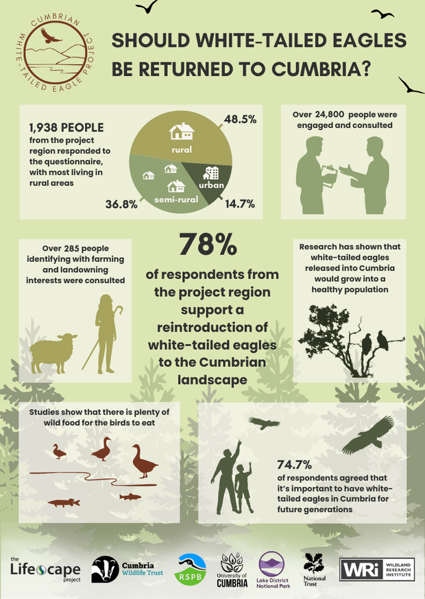 The Cumbrian White-Tailed Eagle Project is led by The Lifescape Project charity and supported by a steering group including the University of Cumbria, Cumbria Wildlife Trust, RSPB, the Wildland Research Institute, Lake District National Park Authority, the National Trust, and local estate owners and managers.